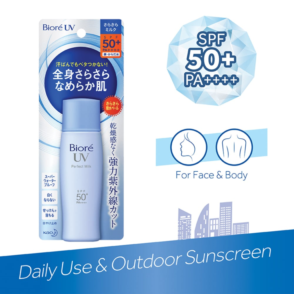 Biore sarasara uv perfect face milk, spf50+. Kao biore uv sunscreen aqua rich watery essence spf50+ pa++++. Biore uv perfect face milk contains 25 ingredients. According to biore, perfect face milk (white bottle). It's not greasy at all and makes my skin feel very soft.